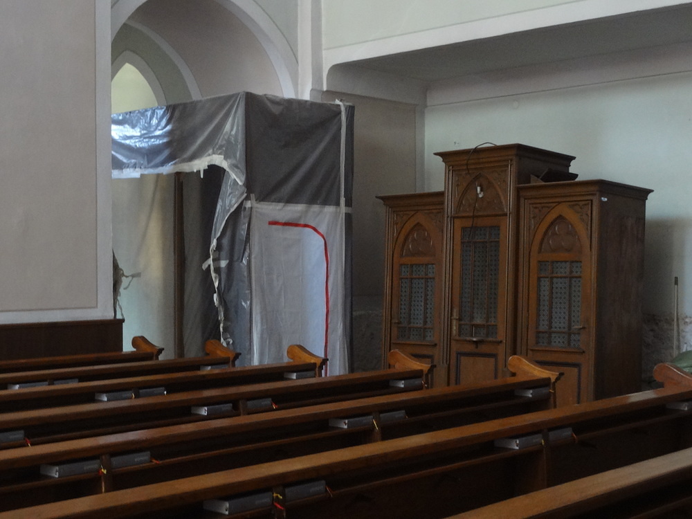 Seit Anfang Juli ähnelt die Kirche im Inneren einer Baustelle. In 173 Arbeitsstunden haben Freiwillige den Verputz, der über die Jahrzehnte mürbe geworden ist, abgeschlagen und entsorgt. So kann in den kommenden Monaten das Mauerwerk besser „atmen“ und die Feuchtigkeit entweicht.
